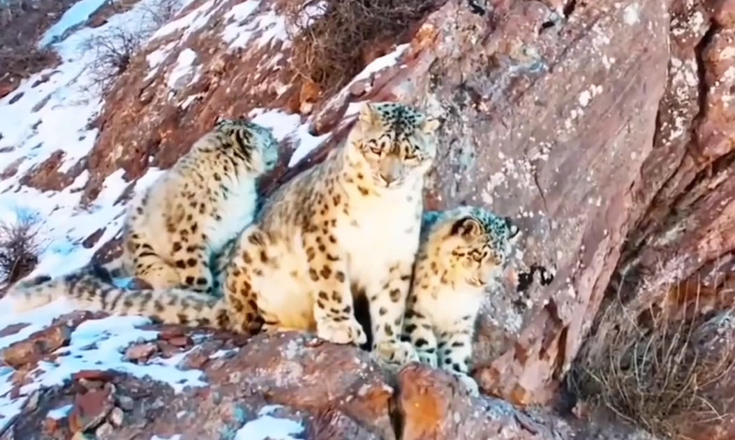 近日,青海省海北藏族自治州祁连县牧民拍到罕见画面,一只成年雪豹正带领两只幼崽在山上活动,画面尽显温情。