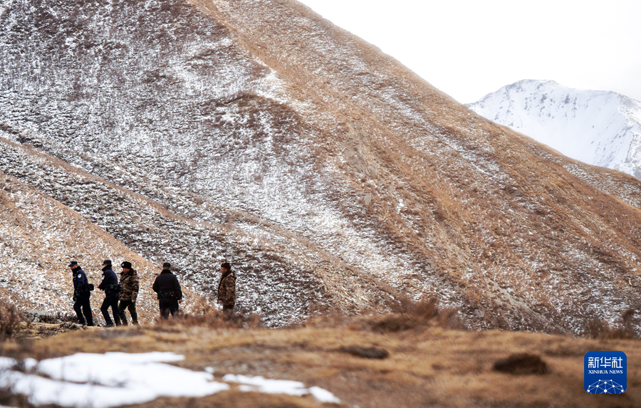 1月8日,在青海省海北藏族自治州门源回族自治县境内的老虎沟,民警和生态管护员在巡护祁连山。新华社记者 齐芷玥 摄