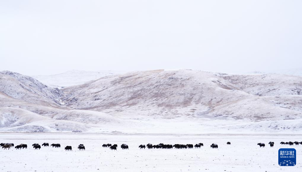 1月29日,一群牦牛在青海省玉树藏族自治州杂多县境内的草原上觅食。新华社记者 齐芷玥 摄